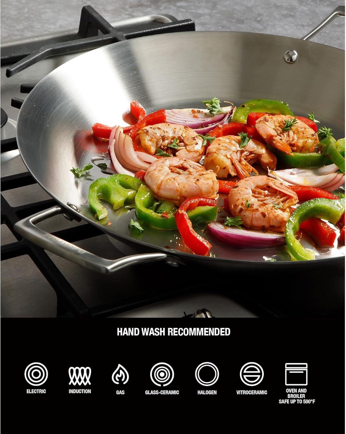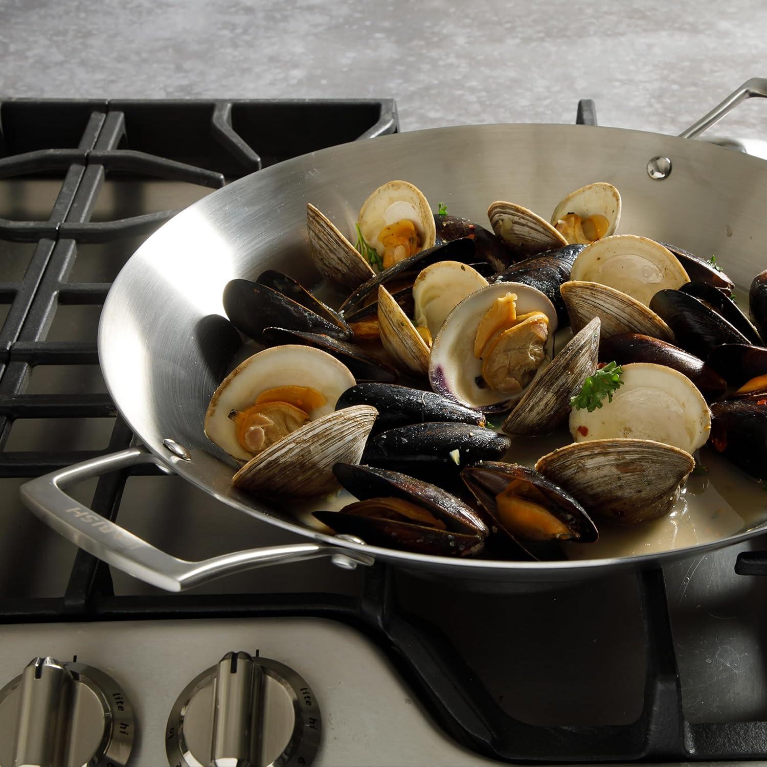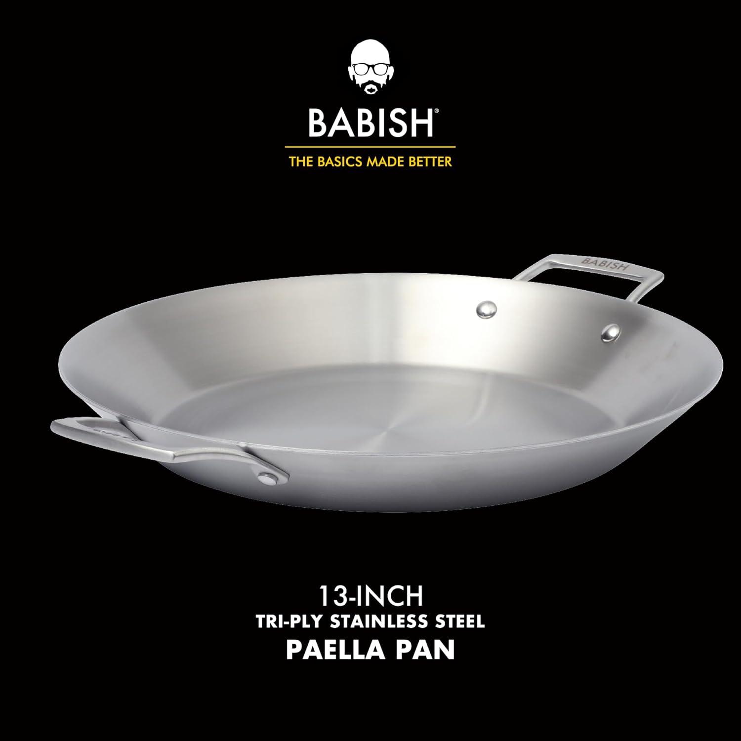 Babish 13 Inch Tri-Ply Stainless Steel Paella Pan, Large Skillet, Griddle, Frying Pan – Induction Safe