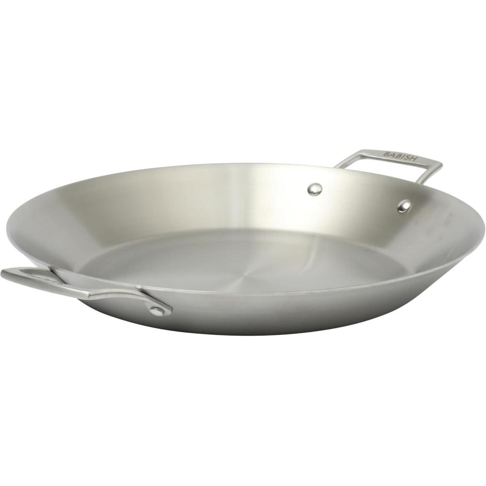 Paella is a traditional recipe that celebrates flavors and sklll in a one-pan meal. As tasty as it is filling, this classic rice dish is known for its well-done bottom crust called “soccarat” to provide a crispy contrast to the tender textures of meat, seafood and vegetables. The Babish Paella Pan is the right pan to meet all the specific requirements to serve up a traditional paella dish, transporting you and your guests to Valencia – a small village in Spain where paella originated from. The paella pan's tri-ply stainless steel construction encapsulates a seamless aluminum core for uniform heat absorption and distribution from the base to the rim. The wide shape and sloping sides maximize the heat to reduce broth and sear food evenly. Safe on all stovetops, this non-reactive stainless steel pan features double-riveted side handles to offer balance when lifting and serving. Oven safe up to 500°F. Hand wash recommended.