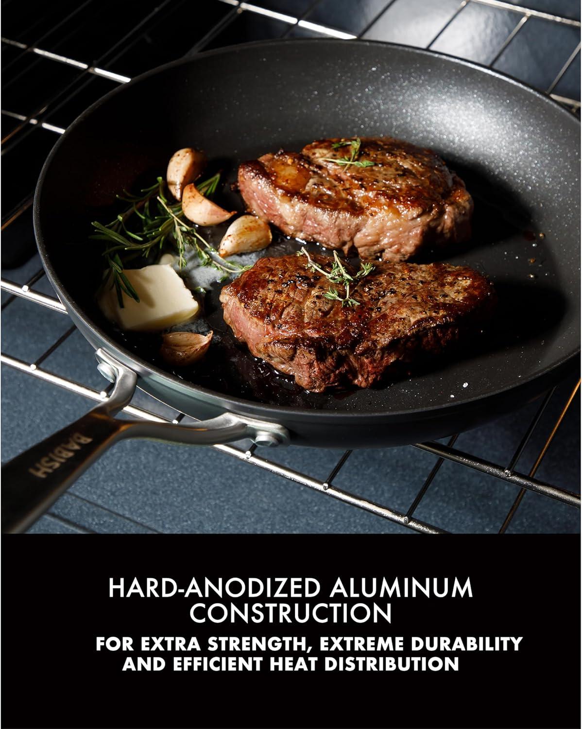 The Babish 2-piece ActivBond™ Nonstick Hard-anodized Aluminum Frying Pan Set offers an innovative nonstick capability to raise the bar and quality of everyday dishes. Heated at 30,000°F, the ActivBond™ technology seals the interlocking layers of hard-anodized aluminum and triple-layer nonstick coating for superior durability and easy-release finish. Made without PFOA, lead, or cadmium, our scratch-resistant coating sears meat better than any stainless steel cookware and cleans up easily after every use. Constructed from a special process to make a more durable structure, both pans are made from hard-anodized aluminum for extra strength, long-lasting performance, and efficient heat distribution. Riveted stainless steel handles feature a Y-shaped design to dissipate heat better, providing a stronger and safer grip. Safe to use in the oven up to 500°F and on all kinds of stovetops, this frying pan set allows home chefs to experiment, create, and master signature recipes and restaurant-quality dishes with a homemade flair. Dishwasher safe, hand wash recommended.