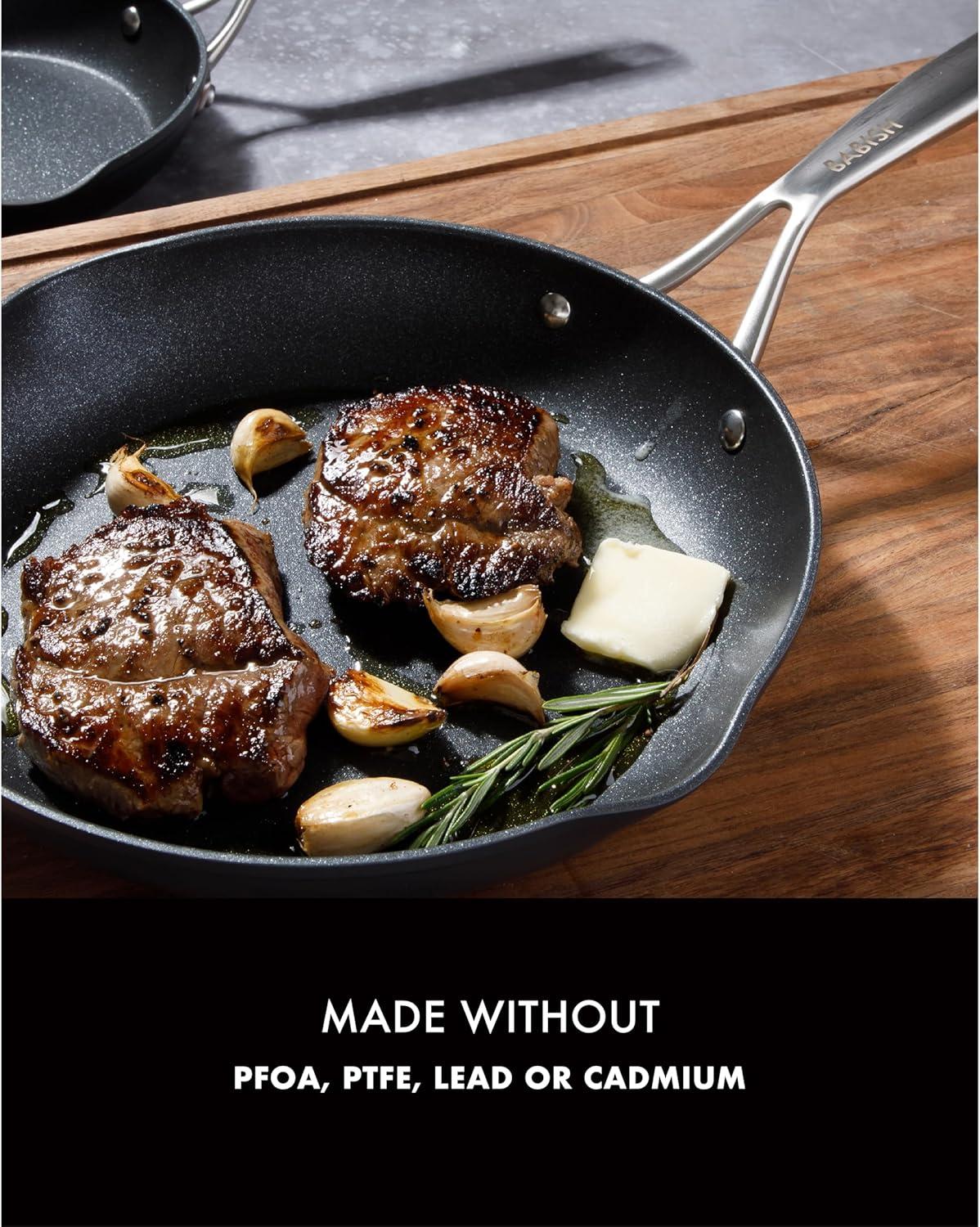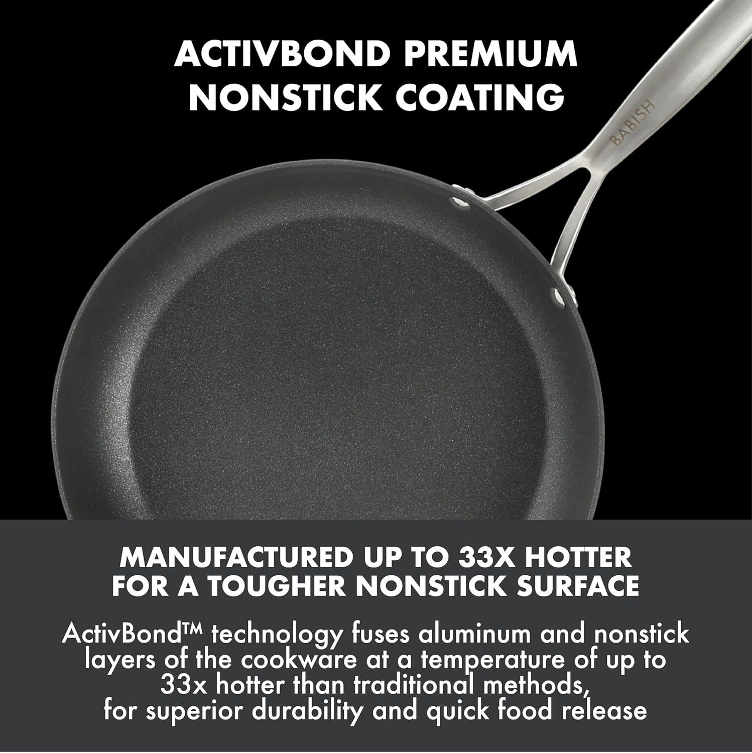 The Babish 2-piece ActivBond™ Nonstick Hard-anodized Aluminum Frying Pan Set offers an innovative nonstick capability to raise the bar and quality of everyday dishes. Heated at 30,000°F, the ActivBond™ technology seals the interlocking layers of hard-anodized aluminum and triple-layer nonstick coating for superior durability and easy-release finish. Made without PFOA, lead, or cadmium, our scratch-resistant coating sears meat better than any stainless steel cookware and cleans up easily after every use. Constructed from a special process to make a more durable structure, both pans are made from hard-anodized aluminum for extra strength, long-lasting performance, and efficient heat distribution. Riveted stainless steel handles feature a Y-shaped design to dissipate heat better, providing a stronger and safer grip. Safe to use in the oven up to 500°F and on all kinds of stovetops, this frying pan set allows home chefs to experiment, create, and master signature recipes and restaurant-quality dishes with a homemade flair. Dishwasher safe, hand wash recommended.