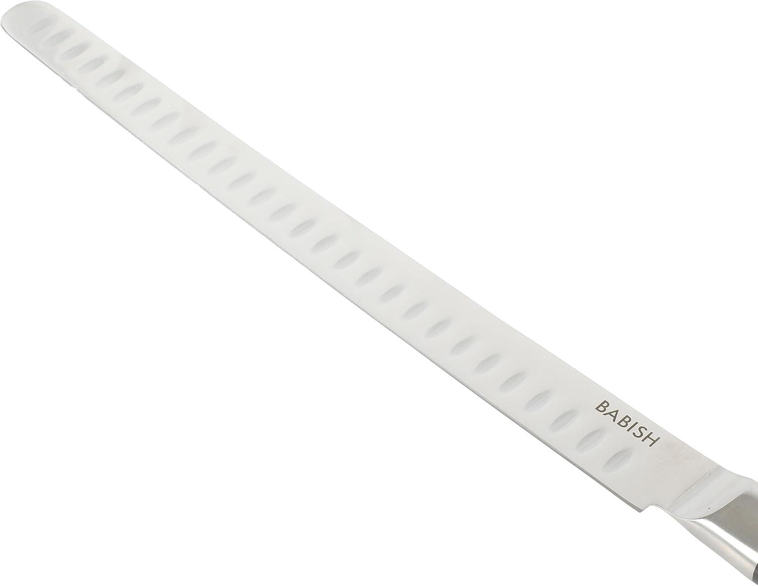 For smoked briskets, roasted birds, and everything in between, this 2-piece German Steel Carving Set from Babish handles tender, flavorful meat with care and precision. The forged German steel construction maintains maximum sharpness and offers superior rust resistance to withstand the demands of everyday use and holiday roasts. Full-tang blades provide even weight distribution for better support and control. Masterfully crafted to yield clean slices every time, this carving set is a reliable choice for ensuring safety and efficiency—whether the pitmaster is serving thinly sliced brisket or the guest of honor is upholding the family's Thanksgiving traditions. Hand wash only.