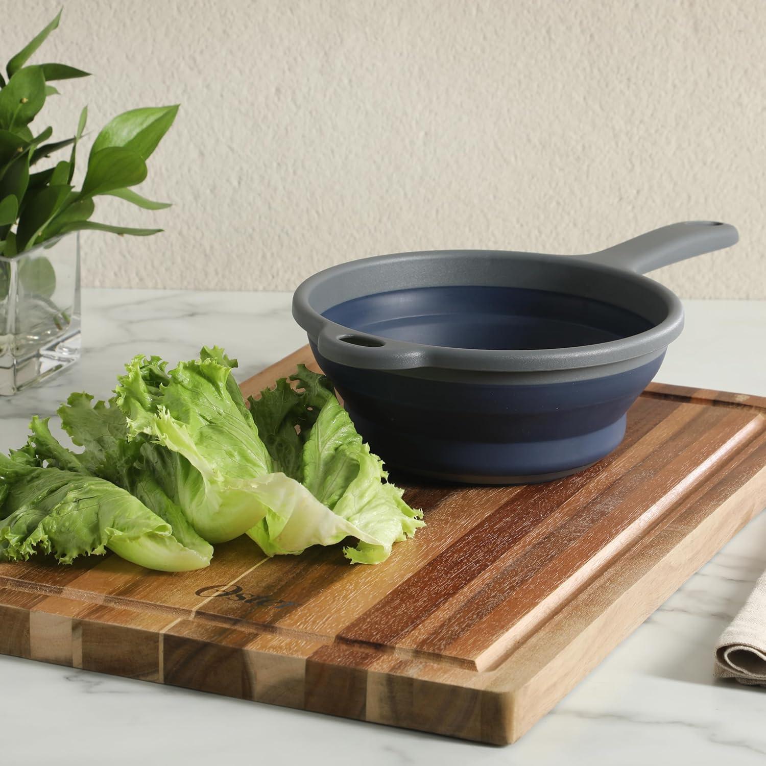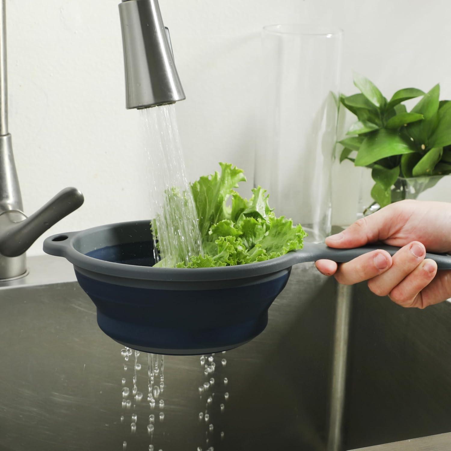 Wash fresh picks from your small vegetable garden or the weekend market in the Bluemarine 10-inch Square Collapsible Colander from Oster™. Made from BPA-free polypropylene plastic, this compact kitchen tool offers an expandable interior to hold and accommodate stacks of ingredients when washing and straining. It has side handles to provide a sturdy grip and to help the colander sit neatly on the edges of the sink. Slim design saves space in any cabinet or storage. Dishwasher safe.