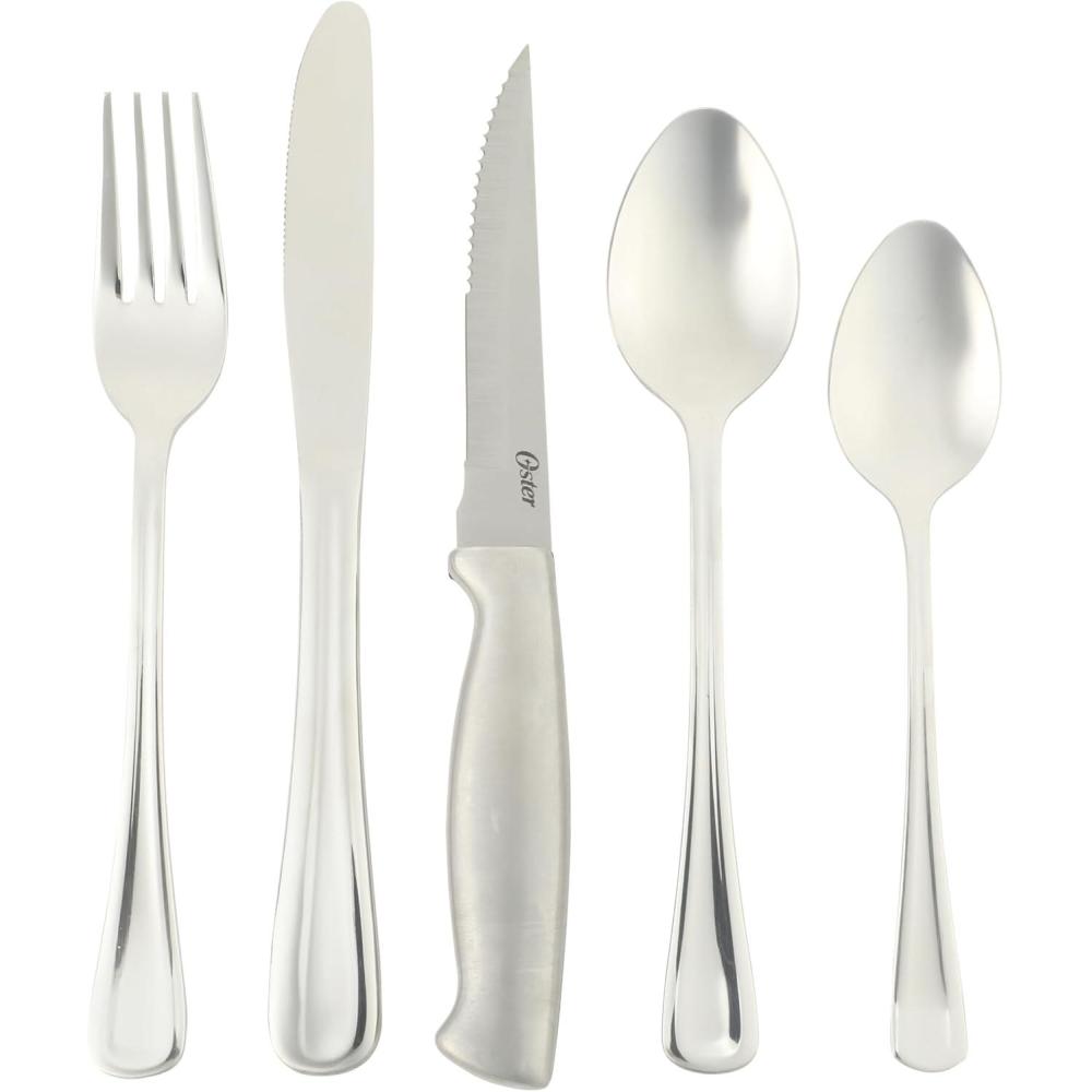Well-planned place settings shine with the sleek accent of beautifully chosen silverware.The Oster™ Bella Vista Stainless Steel Flatware Set brings timeless style and everyday durability to the table, with a mirror-polished finish and balanced weight that feel as elegant as they look. Suitable for service for four, this set includes four extra steak knives to handle main courses and proteins, delighting guests at every meal. Their sharp blades slice cleanly without crushing and provide control with every cut. Dishwasher safe.