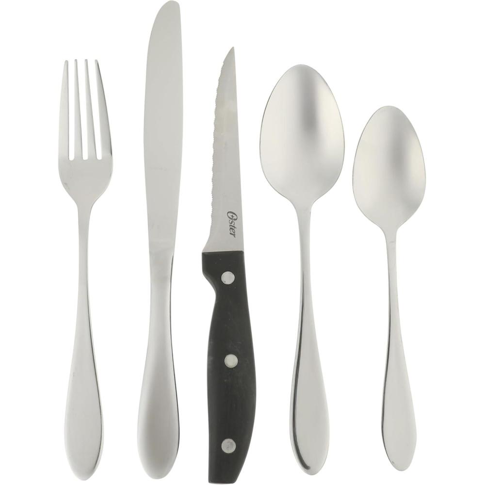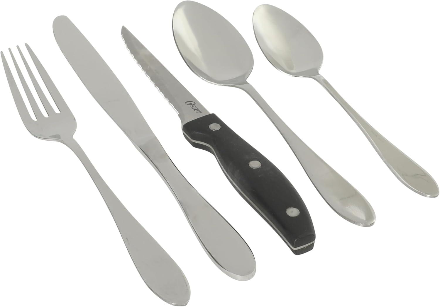 Well-planned place settings shine with the sleek accent of beautifully chosen silverware.The Oster™ Bella Vista Stainless Steel Flatware Set brings timeless style and everyday durability to the table, with a mirror-polished finish and balanced weight that feel as elegant as they look. Suitable for service for four, this set includes four extra steak knives to handle main courses and proteins, delighting guests at every meal. Their sharp blades slice cleanly without crushing and provide control with every cut. Dishwasher safe.