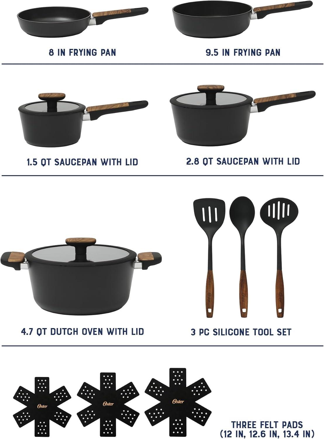 From the Oster™ Platinum Collection, the Abbottsford 11-inch Nonstick Aluminum Wok expresses a bold and modern take to everyday cooking. With a deluxe colorway of black and gold, this aluminum wok efficiently prepares and cooks meals with elegance and style. This wok has optimal nonstick properties for the best food release and the most convenient cleanup. The gold-finish stainless steel handle playfully gives an elevated contrast against the cookware's black exterior finish. Not only is it nice to look at, it is also sturdy to grip – perfect for safe transport and easy serving. Hand washing the cookware is recommended.