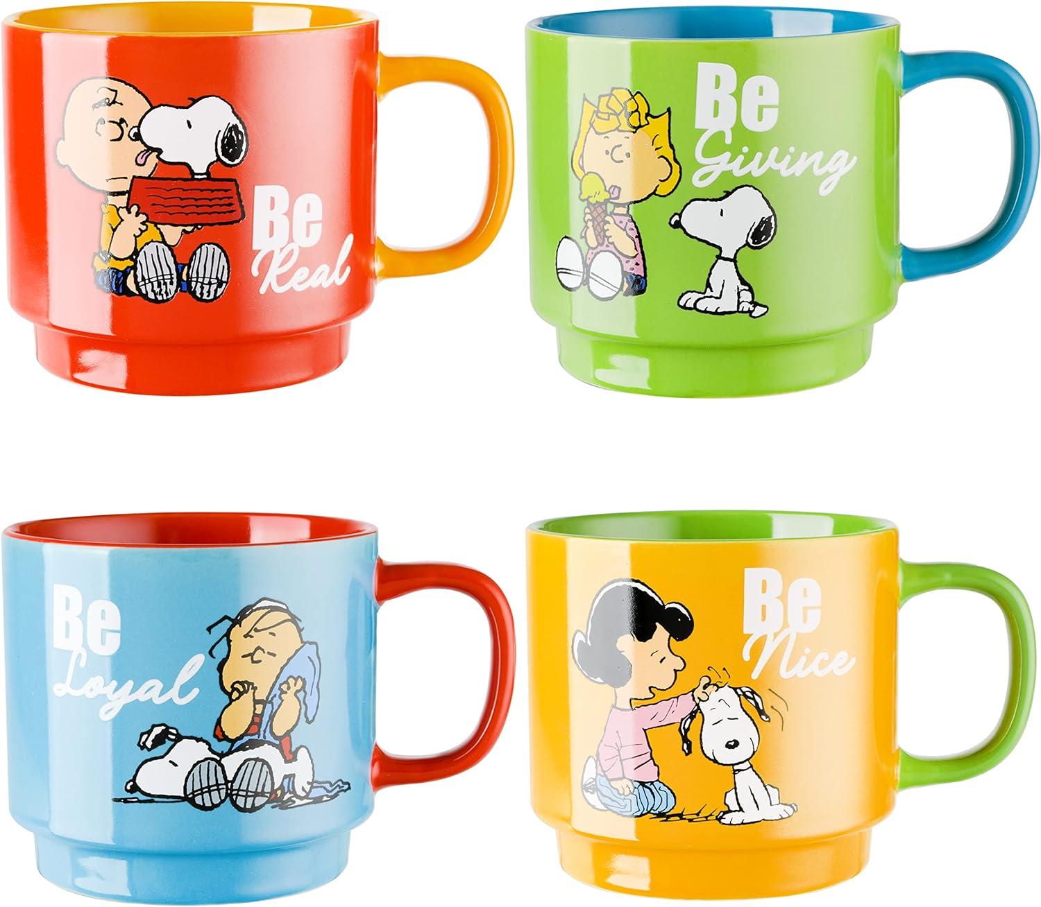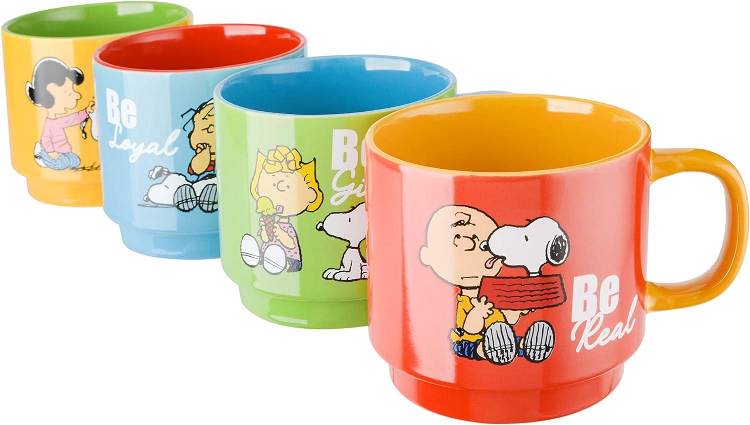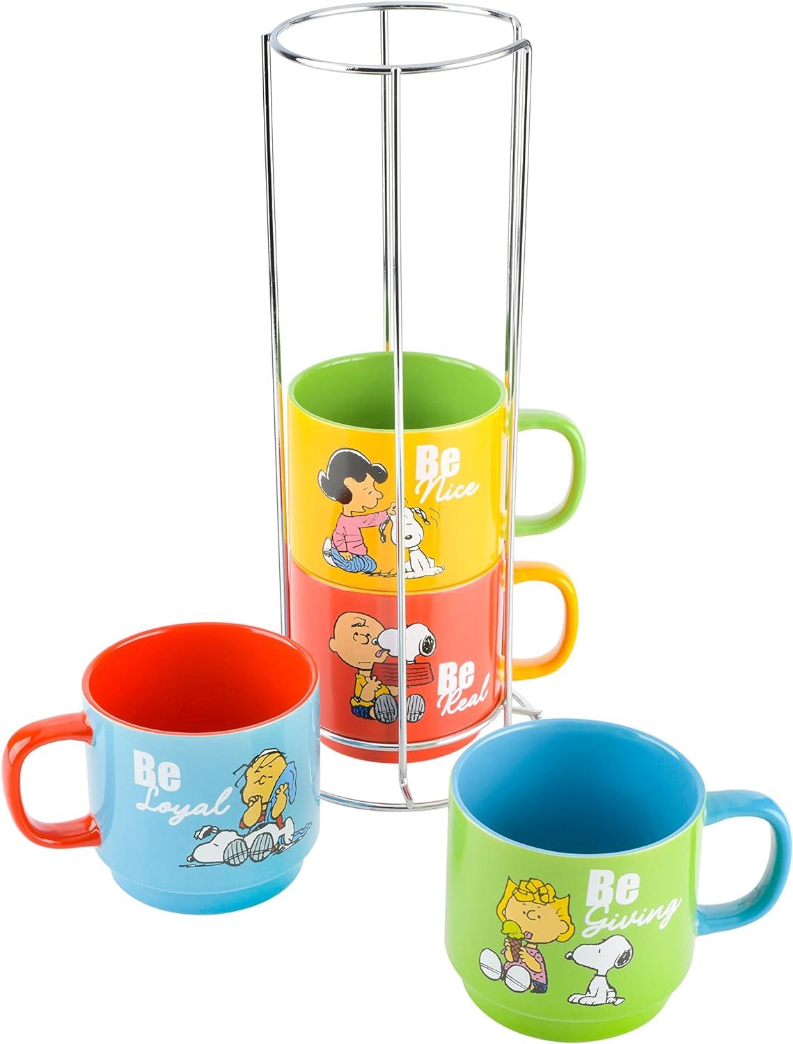 Peanuts Snoopy Happy Sips 4 Piece 23 OZ Tumbler Set with 4 Bamboo Lids and 4 Straws Set, Iced Coffee, Smoothie, Water Cup – Dishwasher Safe(15oz Stackable Mugs w/Rack)
